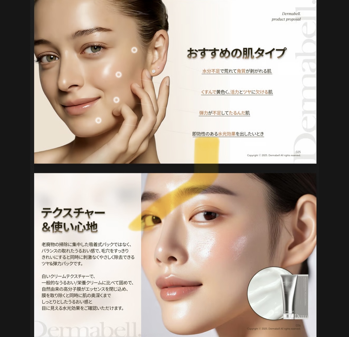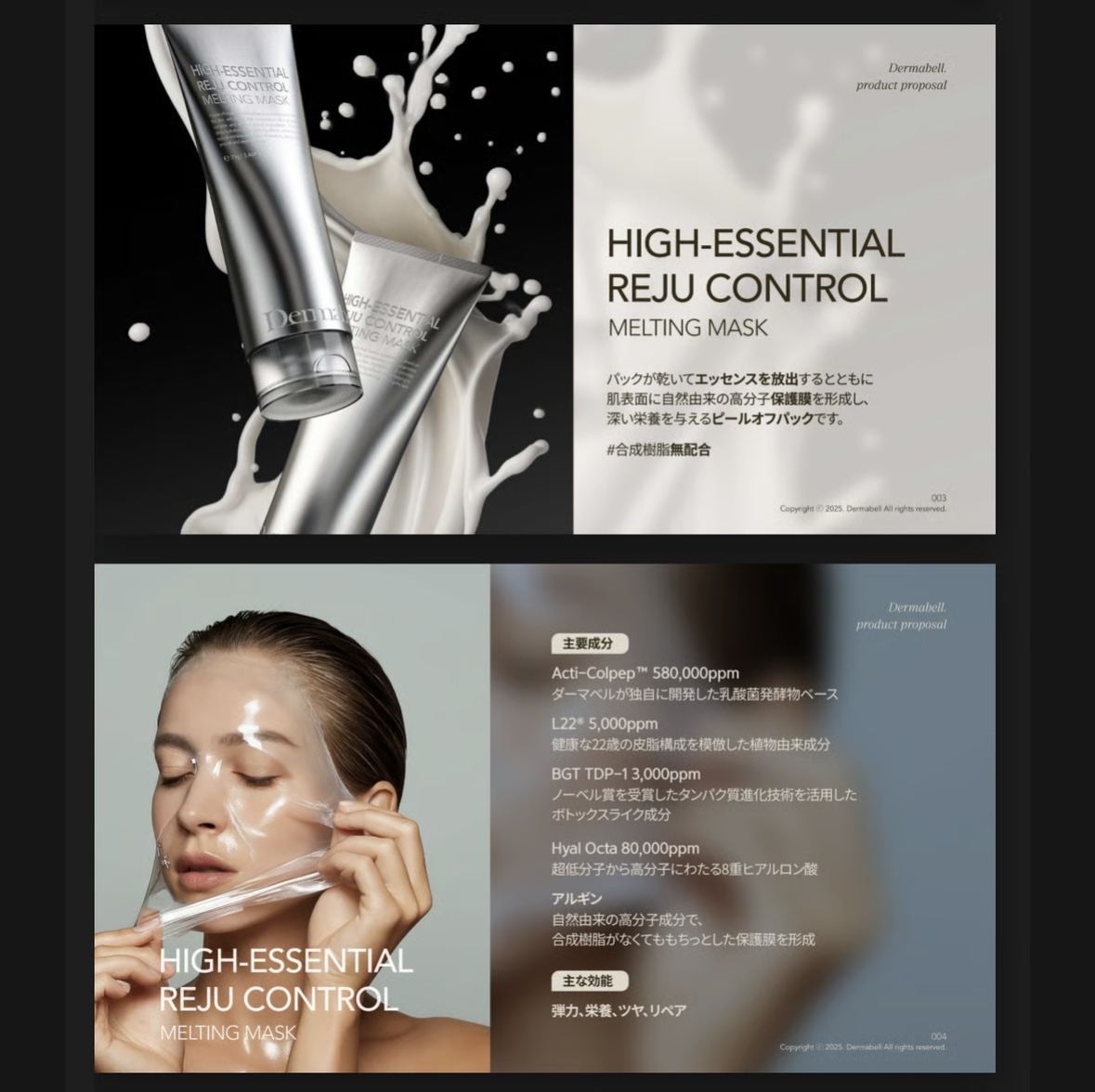 ▷ 韓国美容の“本物”が、いよいよ日本上陸。 韓国の⽪膚科やエステティックサロンでも実際に導⼊されている、 プロ仕様のオールインワンパック。 モデリングパック部門5冠受賞、 8年連続⼤韓民国顧客満⾜度 第1位の実績を誇る 【Dermabell(ダーマベル)】の最新作。